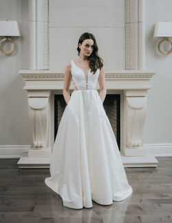 The Claire is simple and modern, sleek and daring. The unique cutouts create the illusion of a smaller waistline. It also features an open back and a big skirt with hidden pockets. This gown has it all!